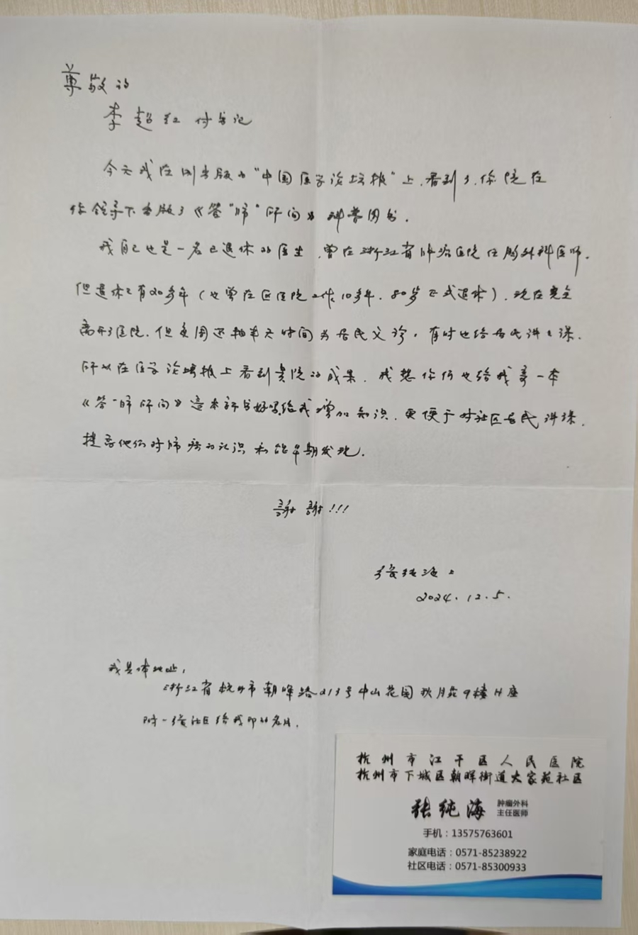 “我从前也是一名社区医生,在医院工作到80岁才正式退休,但现在我每周还会抽出半天时间,为居民义诊。从报纸上我看到了你们的《答“肺”所问》新书,可否寄一本给我增加知识,便于给居民讲课?”